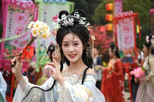 福山锦绣百花朝,云鬓花颜金步摇,今天东莞晴空万里,衣袂飘飘的“花神”如约来到观音山——第三届东莞观音山花朝节游园活动启动,古装丽人作传说中的仙子打扮,与游客赏花接福,簪花游园。