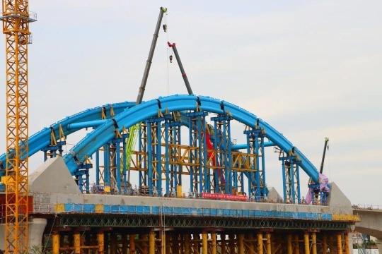 跨东南沙涌96m系杆拱为佛山特大桥四座特殊孔跨桥梁之一,其桥面宽18.6米,拱肋矢高19.2米,拱肋总用钢量约310吨,采用80t汽车吊分18节拱肋和3节横撑吊装施工,最大单节吊装重量约18吨吊高约18.5米。主拱拱肋吊装节段重、体积大,需同时保证高空对接精度、线形和高程控制的要求,安装过程较为繁琐,施工难度较大。针对一系列难题,项目部不断优化拱肋定位、嵌补焊接等施工方案,确保施工安全有序、质量优质。