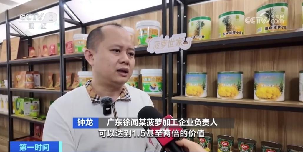 广东徐闻某菠萝加工企业负责人 钟龙:我们原果深加工可以达到1.5甚至两倍的价值,徐闻工厂去年的产值是7000多万,今年的话应该会突破一个亿。