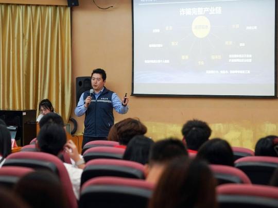 在授旗及授牌仪式后,禅城公安反诈中心讲师卢淳反诈民警结合最新的反诈劝阻案例,从诈骗案件的现状分析、高发类型以及防骗之道入手,深入浅出地为同学们上了一堂生动的反诈课。