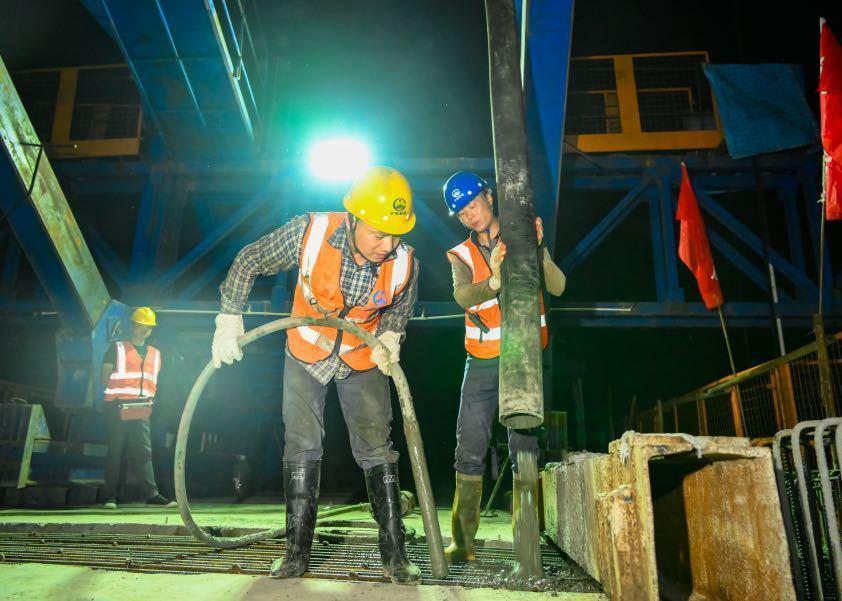 主跨合龙是控制全桥受力状况和线形的重要工序,也是整个桥梁施工过程中技术难度最大、安全风险最高和质量控制最难的关键工序。为确保主跨顺利合龙,施工方中铁四局科学组织、精心统筹,多次组织召开主跨合龙工作专题会议,不断优化施工方案,浇筑前安排技术团队对梁段标高、轴线偏位和环境温度等参数进行48小时连续观测,以确定最佳合龙时间,同时协调各部门做好人、机、物、料资源调配,保证现场各项工序衔接到位。浇筑过程中,还增派技术员、试验员和安全管理专员全程盯控、严格把关,对浇筑施工各个阶段情况进行跟踪观测和适时调整,尽可能将施工偏差控制在15毫米以内,确保混凝土浇筑质量符合要求。