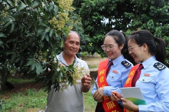 税务人员走进荔枝种植园,了解荔枝开花坐果情况,送上涉农税惠政策。
