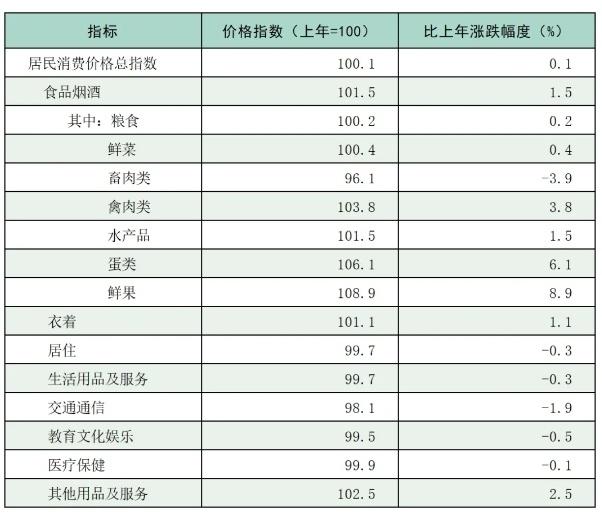 公报显示,2023年居民消费价格比上一年上涨0.1%,其中消费品价格下降0.3%,服务价格上涨0.5%。分类别看,食品烟酒价格上涨1.5%,其他用品及服务和衣着价格分别上涨2.5%和1.1%;交通通信、教育文化娱乐、居住、生活用品及服务和医疗保健价格分别下降1.9%、0.5%、0.3%、0.3%和0.1%。工业生产者出厂价格下降0.8%,其中轻工业价格上涨1.0%,重工业价格下降2.2%。