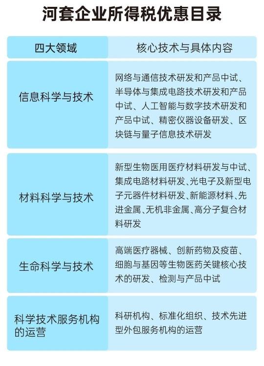 而今年1月8日,财政部、税务总局印发《关于河套深港科技创新合作区深圳园区企业所得税优惠政策的通知》(以下简称《通知》)(财税〔2024〕2号),明确对河套深港科技创新合作区深圳园区特定封闭区域符合条件的鼓励类产业企业,减按15%的税率征收企业所得税。河套企业所得税优惠目录涵盖4大领域,12项核心技术,33项具体内容。(具体内容可详细查看《河套深港科技创新合作区深圳园区企业所得税优惠目录》)