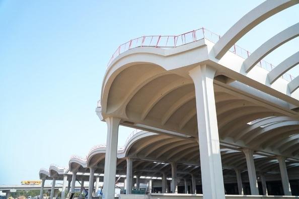 站房北弧形雨棚是全国首例异形多曲全现浇拱形仿清水混凝土雨棚,建筑面积为1.8万平方米,曲面壳体连绵10拱,达到海潮叠起的效果。由于车站高速场、普速场和正线的轨道线型变化,雨棚每一跨尺寸各异,跨度从12米到24米不等,最大拱径近19米,最大拱高超3米,梁板曲率近500种,雨棚所有结构均需要现场浇筑。