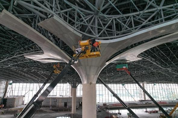 “沿海环境下,相较钢结构雨棚,仿清水混凝土雨棚具有更佳的耐盐酸、抗腐蚀及抗台风性能,有利于降低运营期间的维保难度。”中铁建设新建汕头站项目负责人介绍。新建汕头站践行“重结构、轻装饰、简装修”理念,遵循“建构一体化”原则,结构施工时同步深化完善建筑造型需求,在满足使用功能的基础上以简洁线条展现结构之美。候车大厅顶部多处树状钢桁架直接裸露,由航空级不锈钢制作的多曲面异形蒙皮参与结构受力,为确保弧形吊顶效果,团队利用三维激光扫描仪对候车大厅钢结构进行3D激光扫描,逆向精准建模辅助外贴钢板生产,引进钢结构空间测量扫描机器人、自动焊接机器人协助施工,保证吊顶各处曲面精确衔接、分割线条优美。