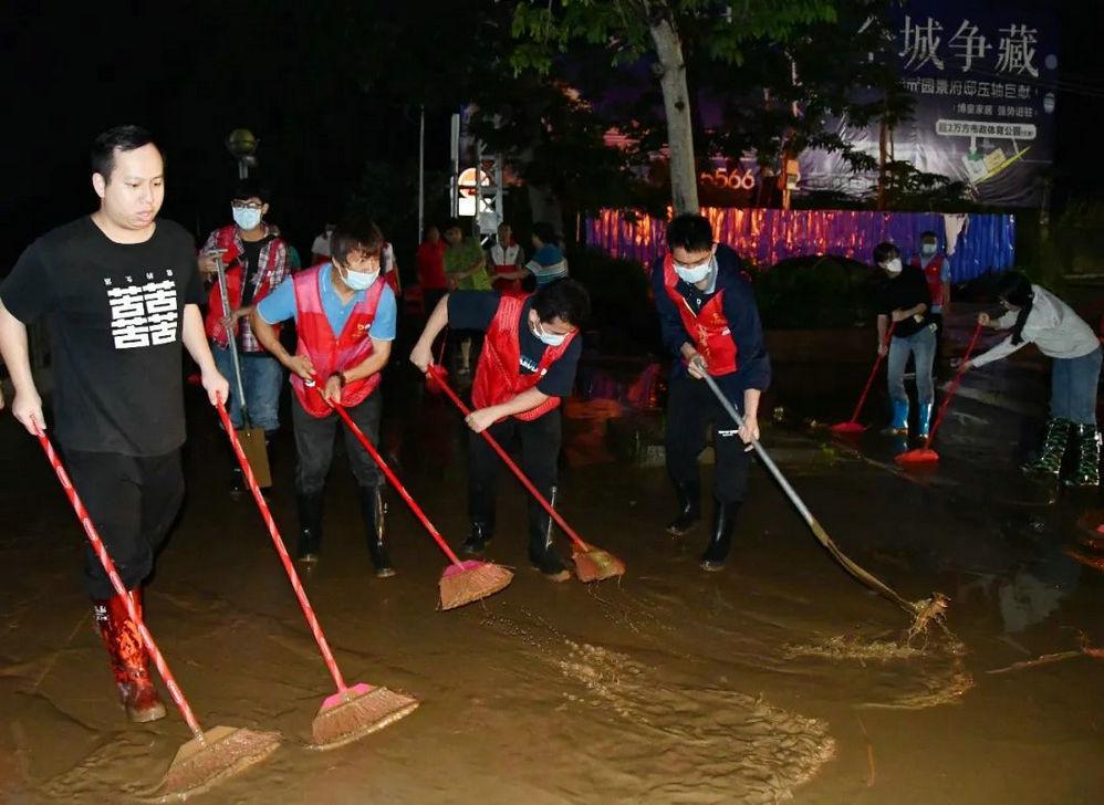 在龙头湾至上郭桥、解放北路、金龙一路受浸路段清淤点,记者看到,身穿红马甲的党员干部、志愿者纷纷拿着铁锹、大扫帚迅速投入紧张有序的清淤工作,在各式喷洒车的配合下,及时清扫淤泥和垃圾。