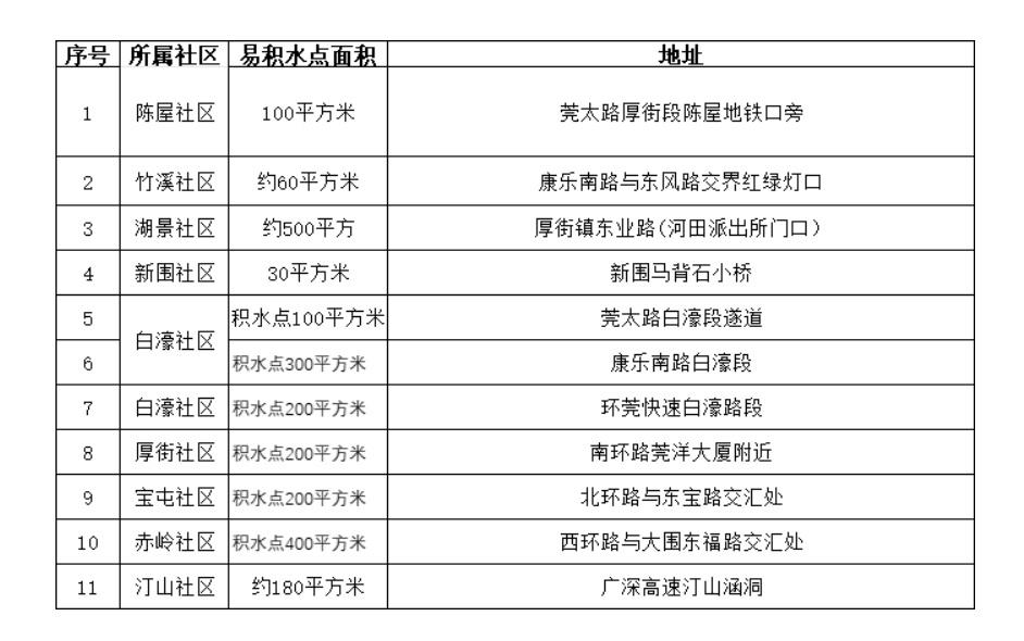 今天上午,记者从东莞市厚街镇获悉,今年以来,该镇共排查出11个易积水点,具体如下: