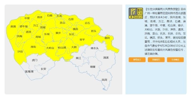 目前广州一带有雷雨云团向东莞市西北部靠近,预计未来4小时,该市莞城、东城、南城、万江、高埗、石碣、麻涌、望牛墩、中堂、松山湖、寮步、大岭山、大朗、沙田、厚街、道滘、洪梅、茶山、石龙、石排、企石、东坑、横沥、桥头、常平、谢岗有较强雷雨,并伴有8级左右短时大风,东莞市气象台于4月28日8时32分对上述镇街发布雷雨大风黄色预警信号,请注意防御。