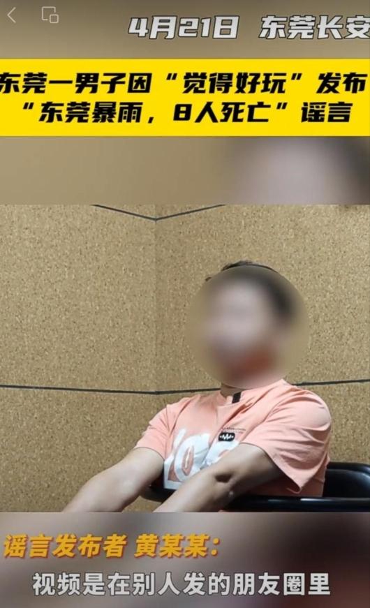 4月21日,东莞网警工作发现,网民黄某某在多个视频平台发布短视频,视频画面显示路面积水严重,并配有文字“东莞暴雨8人死亡事件”。该视频迅速引起网民关注,引发大量浏览,对社会造成一定影响。