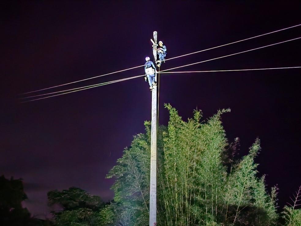 由于连日来的强降雨,广东梅州大埔湖寮镇、百侯镇、茶阳镇等山体土壤饱和,多处山体出现滑坡现象。“班长,莒村圣公塘附近山体滑坡,大树压在电线上,需要紧急处理。”4月28日,南方电网广东梅州大埔供电局湖寮供电所接到群众反映,山体滑坡导致连片的树木随着坍塌的土方倾倒下来,压住了山下的电杆和线路,导致该地区部分用户停电。接到信息后,供电所马上组织人员展开抢修,奋力清除倾倒在线路上的树木,并重新驳接线路,以最短的时间恢复正常供电。
