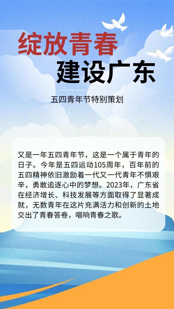 又是一年五四青年节,这是一个属于青年的日子。今年是五四运动105周年,百年前的五四精神依旧激励着一代又一代青年不惧艰辛,勇敢追逐心中的梦想。2023年,广东省在经济增长、科技发展等方面取得了显著成就,无数青年在这片充满活力和创新的土地交出了青春答卷,唱响青春之歌。