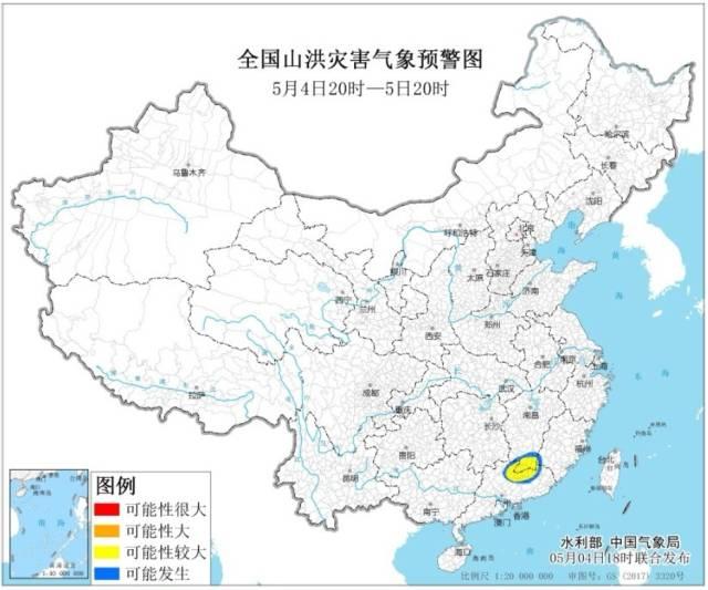 同时,水利部中国气象局联合发布黄色山洪灾害气象预警,预计5月4日20时-5日20时,福建西南部、江西南部、广东北部等地部分地区可能发生山洪灾害(蓝色预警),局地发生山洪灾害可能性较大(黄色预警)。