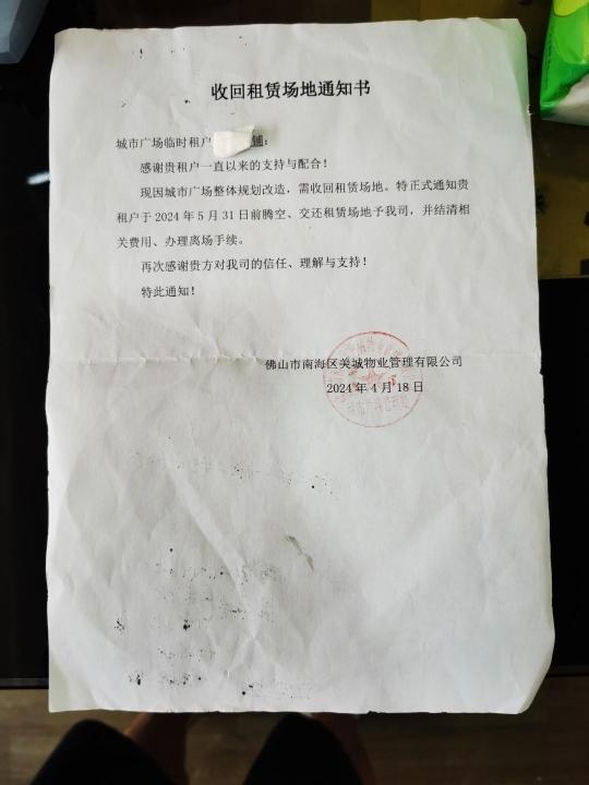记者从租户收到的《收回租赁场地通知书》看到,该通知书的发出时间是4月18日,收回场地的原因是城市广场“整体规划改造”,而腾空、交还场地给管理方的最后期限为2024年5月31日。不过不少租户都表示,双方口头约定交还铺面的实际时间为5月28日。