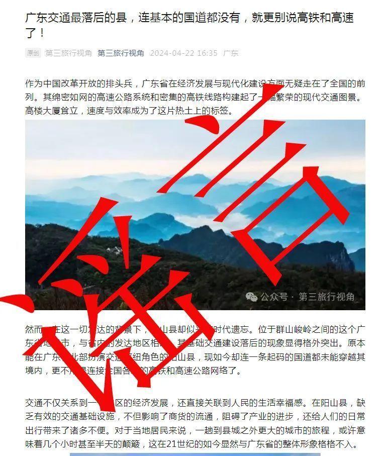 近日,某自媒体发布图文“在广东交通最落后的县,连基本的国道都没有,就更别说高铁和高速了……”,提到的内容与阳山县实际交通公路网不符,为不实信息,对阳山县城市形象以及经济社会发展造成不良影响,今日阳山发布官方辟谣,请广大网民不信谣、不传谣。