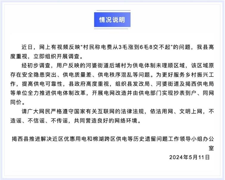 5月12日凌晨,“揭西发布”微信公众号发布一则情况说明,广东省揭阳市揭西县推进解决近区优惠用电和棉湖跨区供电等历史遗留问题工作领导小组办公室通报称:近日,网上有视频反映“村民称电费从3毛涨到6毛8交不起”的问题,该县高度重视,立即组织开展调查。