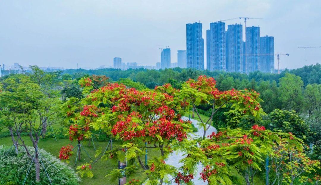 在绿叶的衬托下,凤凰红更为艳丽,衬托出城市蓬勃的生机与活力。
