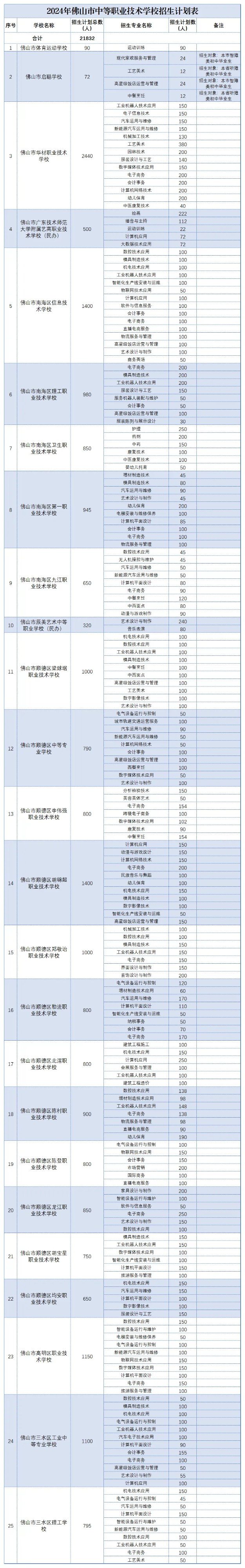 2024年佛山全市中等职业学校(不含技工院校)招生计划21832人,其中公办中职学校招生计划21012人,民办中职学校招生计划820人。
