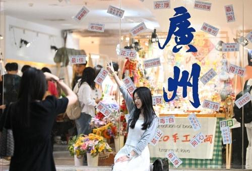 游客在广州沙面的店铺打卡拍照。记者 邓华 摄