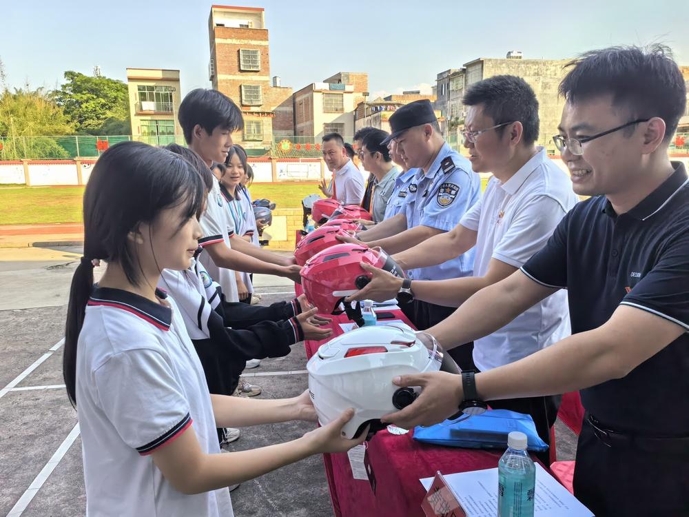 随后,出席活动的领导嘉宾、爱心公益人士向学校及学生代表赠送安全头盔。