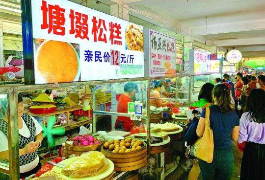 在手机划屏时代才“火”起来的宵村松糕的历史渊源和几乎塘㙍圩一样久远,清乾隆至咸丰年间,塘㙍河两岸的三个小圩合并为塘㙍大圩,临近大圩的宵村,不少村民开始从事圩市饮服业,宵村松糕随后应运而生。现在,在塘缀中心市场附近,已形成“宵村松糕一条街”,不少档主都有几代同斩松糕的家史。