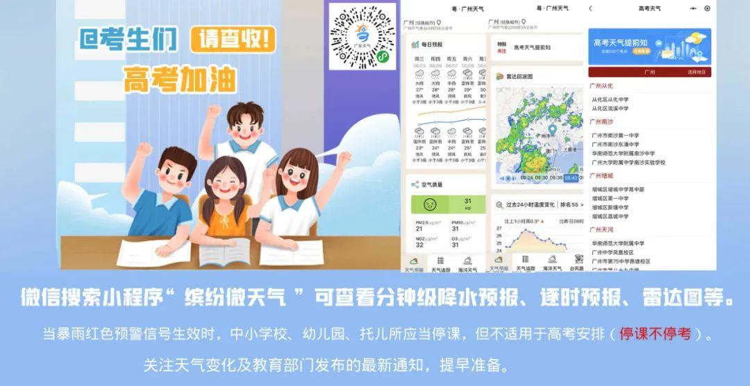 考生、家长可通过“缤纷微天气”小程序、“广东天气”微信公众号、“广东省教育考试院”微信公众号、“停课铃”APP获取服务。