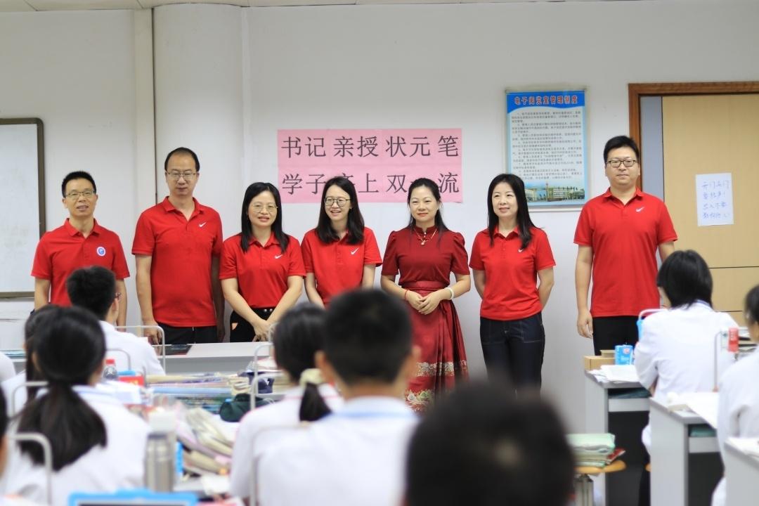将祝福穿在身上的,除了旗袍,还可以是时下最受欢迎的“国风古着”马面裙。在顺德区乐从中学,高三的送考老师一起约定穿上了颜色喜庆、设计别致的马面裙,一改老师平日的严肃气质,为考生营造轻松、喜庆的考前氛围。现场,该校领导还亲自为考生送上“状元笔”,期盼考生能考生“双一流”名校,叩开人生崭新的大门。