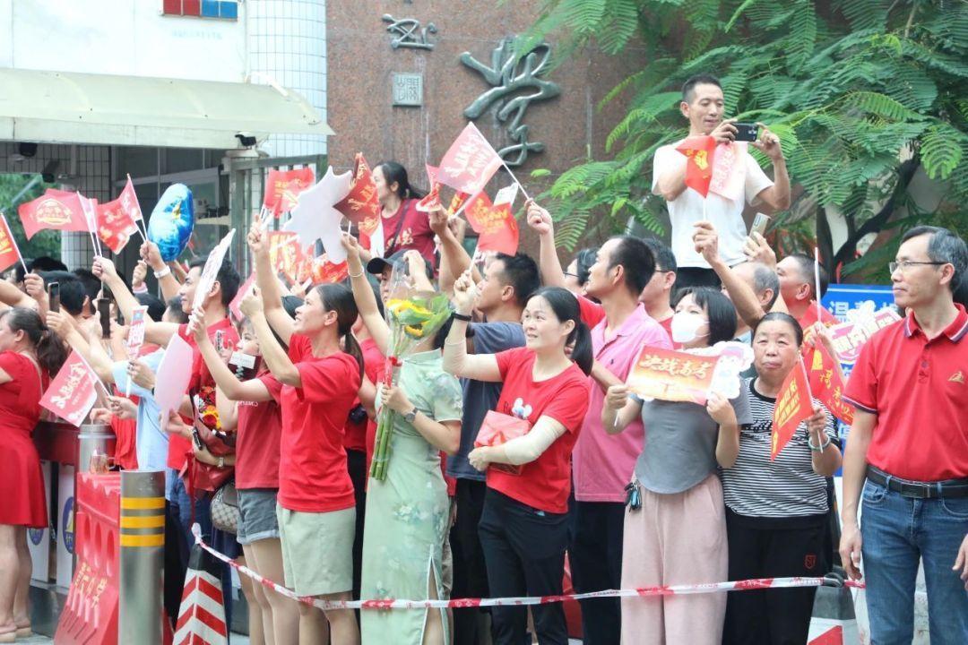 最热闹的送考仪式,怎么少得了击掌鼓气。在顺德区龙江中学、桂洲中学、容山中学等学校,送考老师们不约而同身着红衣,在考场大楼前排成两排,给每一位走入考场赴考的考生击掌鼓气。现场,有考生和老师热情相拥,十分动人。