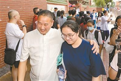 七中考点,等候在考场外的家长搂着走出考场的孩子。