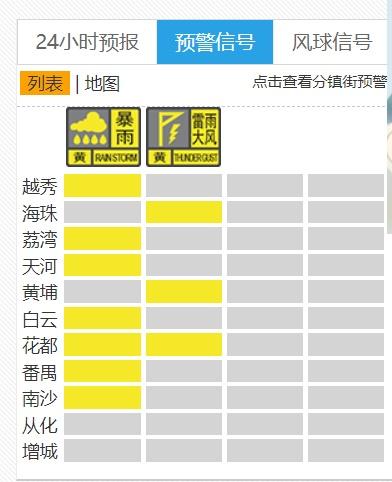 截止9日上午10时,广州多个区已发布暴雨黄色预警、雷雨大风黄色预警信号。