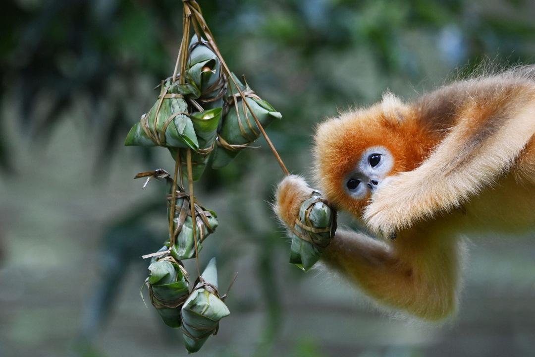 5月10日端午节,深圳野生动物园饲养员特意为该园动物包“粽子”。金丝猴享用“蔬果粽子”、小爪水獭品尝“鱼香粽子”、河马吃“草料粽子”……口味新奇的特色粽子吸引动物品尝,大饱口福。
