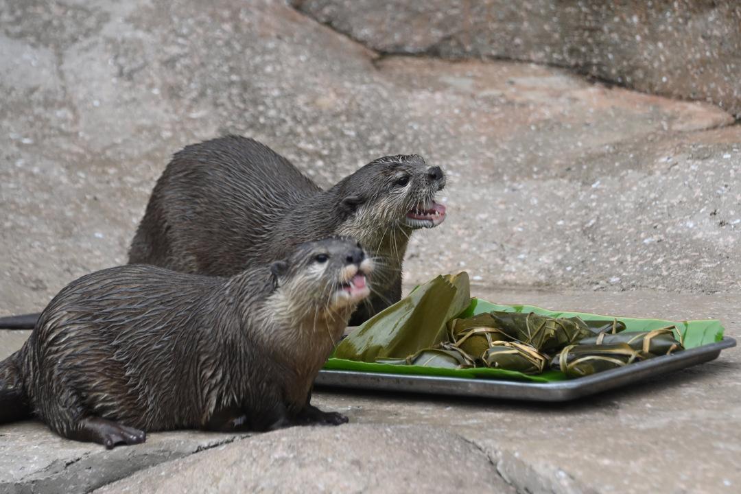 亚洲小爪水獭今年4月入住动物园,第一次在深圳过端午节。饲养员为它们准备了“鱼香粽子”,采用新鲜生鱼片和虾肉包成。绿色的芭蕉叶垫底,上面摆放着“粽子”,十分醒目,散发阵阵“鱼香”吸引小爪水獭前来品尝,大快朵颐。