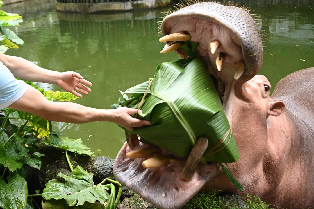 “吃粽子了。”饲养员对着泡在水中的河马喊话。饲养员捧着沉甸甸的大“粽子”引起河马的注意,河马庞大身躯浮出水面,健步走到岸边,张开大嘴吞食整个“粽子”,吃相霸气十足。“河马吃的‘草料粽子’采用象草、红萝卜、地瓜、苜蓿颗粒等食物制作而成,10多斤重。”饲养员说。
