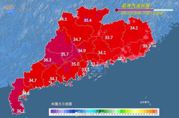 6月20日,韶关、清远多云到阴天,有(雷)阵雨,局部大雨,其余市县多云到晴,有分散(雷)阵雨。最高气温:粤西和珠江三角洲34~36℃,其余大部分市县32~34℃。