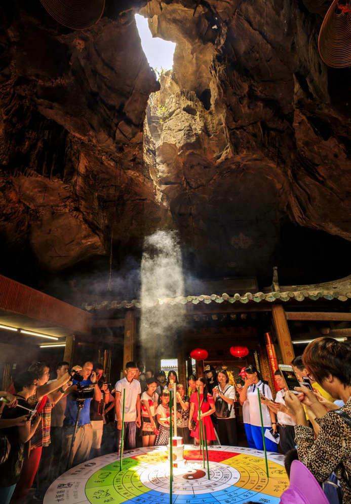 此时,太极洞内烟雾袅袅,汉服小姐姐闻歌起舞、太极队员拳脚生风,让现场的嘉宾、媒体和摄影发烧友,以及自发前来观赏的市民游客们纷纷举起手机狂拍,大赞精彩。正午时分,太阳从东北往西北移动,慢慢出现在被称为“阳洞”的天窗中,大家立即变身“追光者”,眼中紧盯着洞底平台上的立竿。在阳光的照射下,竿子的阴影慢慢变小、变无,这就是“立竿无影”奇观,也是人们以最短距离接触到阳光照耀的“高光时刻”。参加活动的吴先生说:“我是摄影发烧友,每年夏至我必来太极洞拍摄‘立竿无影’的活动花絮,虽然是同一个地方,但每年我都能拍出新花样。还有秋分‘卧佛含丹’、冬至‘月亮垂照’,我都拍了很多相片。”