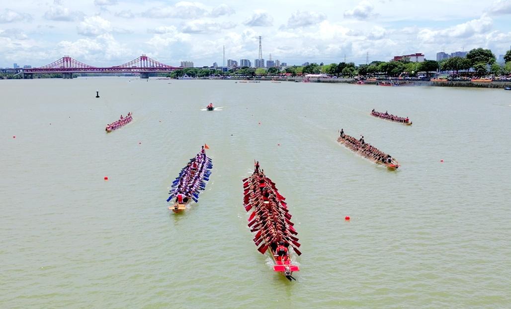 上午11时许,比赛哨声响起,15支龙舟队伍分成3组进行预赛。江面上鼓声震天,船桨齐动,一条条龙舟如离弦之箭,在水面上疾驰而过。岸边的市民纷纷为参赛队伍呐喊助威,加油声与鼓声桨声交织在一起,奏出一首激昂的交响曲。