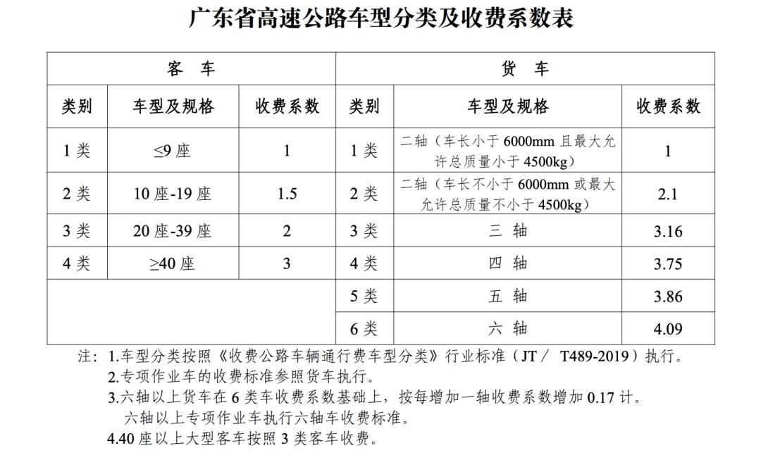 收费车型执行《收费公路车辆通行费车型分类》(JT/T489-2019),项目全线车辆通行费收费标准为66元/标准车次。其中,东人工岛(起点)至西人工岛的收费标准为37元/标准车次、西人工岛至万顷沙枢纽互通的收费标准为23元/标准车次、万顷沙枢纽互通至横门互通(终点)的收费标准为6元/标准车次;1至4类客车的收费系数分别为1、1.5、2、3,其中3类客车、4类客车收费系数按前述系数的60%执行;1至6类货车的收费系数分别为1、2.1、3.16、3.75、3.86、4.09,专项作业车的收费标准参照货车执行。