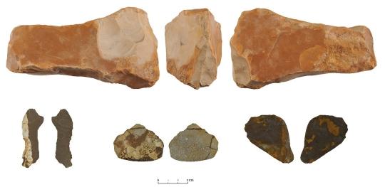 据介绍,本次发掘采用自然层结合水平层的发掘方法,地层自上至下可分为10层,东北西南向的现代沟将发掘区分为南北两个部分。另外,此次考古发掘在旧石器时代堆积中出土石器800余件,石料以霏细岩为主,另有凝灰岩、粗面岩等。石器类型有石锤、砍砸器、刮削器、石核、断块、石片、碎屑等。新石器时代出土遗物有陶片、石器及带有使用痕迹的木器。石器7000余件,以霏细岩为主,少量凝灰岩等,类型有石锤、砍砸器、刮削器、尖状器、使用石片、石叶石核、石叶、细石核以及双肩石器制作过程中产生的石片、毛坯、残断器等。木器10余件,为直径2.2~5厘米的木棍削尖一端制成,尖部可见使用痕迹,完整者长度约1米。