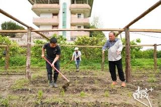 数百米开外的松郊村金果园华侨农场内,80后旅印尼新侨李满意与小伙伴们正在为种下不久的航椒、航茄等农作物翻土,“最近雨水多,就得勤快翻土,养分才不会流失。”
