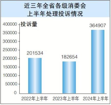 2024年上半年,全省各级消委会处理受理消费者投诉364907件,比去年增加182253件,同比上涨99.78%;为消费者挽回经济损失2.23亿元,比去年增加1.01亿元,同比上涨83.14%。经分析,上半年国家法定节假日集中且消费品以旧换新政策带动消费热情,节日经济及促消费政策效应使消费市场持续升温。与此同时,全省消费维权工作机制不断完善,全国消协智慧3·15平台、广东消费投诉咨询信息化综合平台、地方“民生诉求”等多种形式拓宽消费维权渠道,投诉便捷化、规范化程度不断提高。消费活跃度高及投诉渠道畅通是上半年消费投诉量上涨的主要原因。
