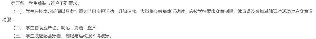 长期以来,穿着礼服出席升旗仪式、集体活动,是深圳中小学生教育特色之一。据相关媒体报道,这项着装要求也经历过修改和优化。根据2009年印发的《深圳市中小学校学生统一着装管理办法》第五条第一款规定:学生在校学习期间以及参加重大节日庆祝活动、升旗仪式、大型集会等集体活动时,应按学校要求穿着制服;体育课及参加其他运动活动时应穿着运动服。