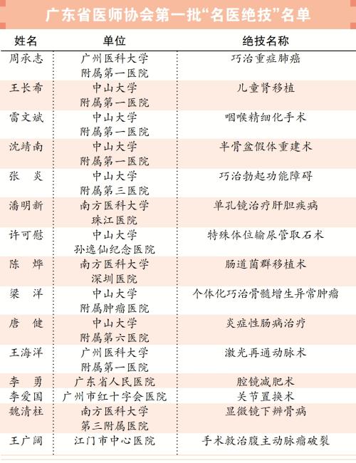 在大会上,广东省第一批“名医绝技”出炉并正式公布,15项绝技入选。据介绍,该名单由协会组织产生,经过个人自荐、协会相关分支机构推荐,同行及专家出具意见等程序产生,将树立广东医师良好形象,展示广东医师的医疗技术水平,激发医师钻研技术的积极性,更好满足人民群众高水平、高质量医疗服务的需求。