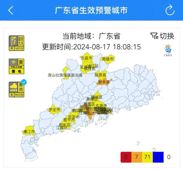 18日,广东南部市县有大雨,局部大暴雨,其余市县多云间阴天,有中(雷)雨局部大雨或暴雨。18日白天最高气温:中北部大部市县31~34℃,其余市县29~31℃。