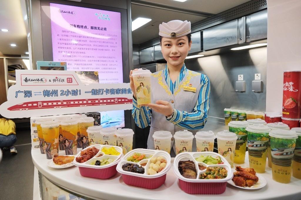 “梅州被誉为‘中国金柚之乡’,为此,我们的高铁奶茶品牌‘那个女孩’专门研发了新品蜂蜜柚子茶,旅客用喝一杯高铁奶茶的时间,就能轻松抵达目的地。”广铁集团餐饮乘务长黄欣雨介绍,“我们还根据沿途地区美食,在餐车上配有客家梅菜扣肉、荔枝肉、三鲜鱼丸等特色风味套餐。”