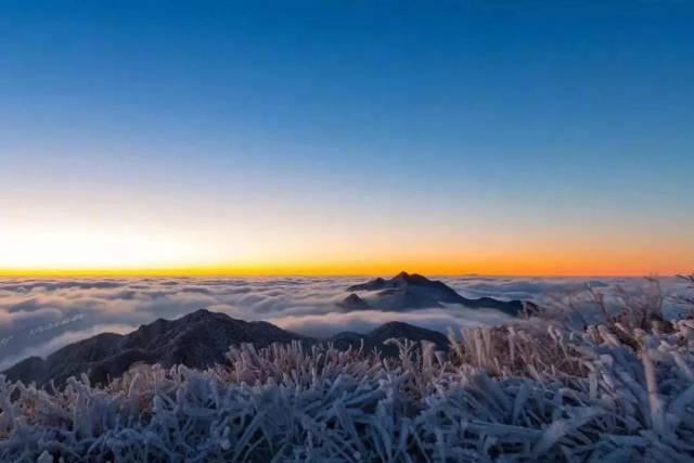连山壮族瑶族自治县金子山日出云海雾凇。