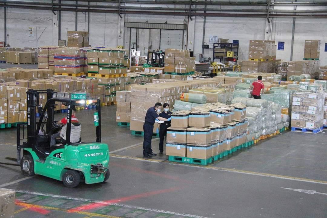 广州白云机场海关关员在国际货站进行巡仓监管。