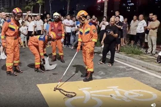 8月19日,湛江市消防救援支队接到报警称,遂溪三中网红街有两条银环蛇出没。救援人员立即赶赴现场,在做好防护后,利用捕蛇钳将两条银环蛇牢牢控制,并迅速将其放进事先准备好的蛇袋中。随后,两条蛇被救援人员带到野外无人处放生。