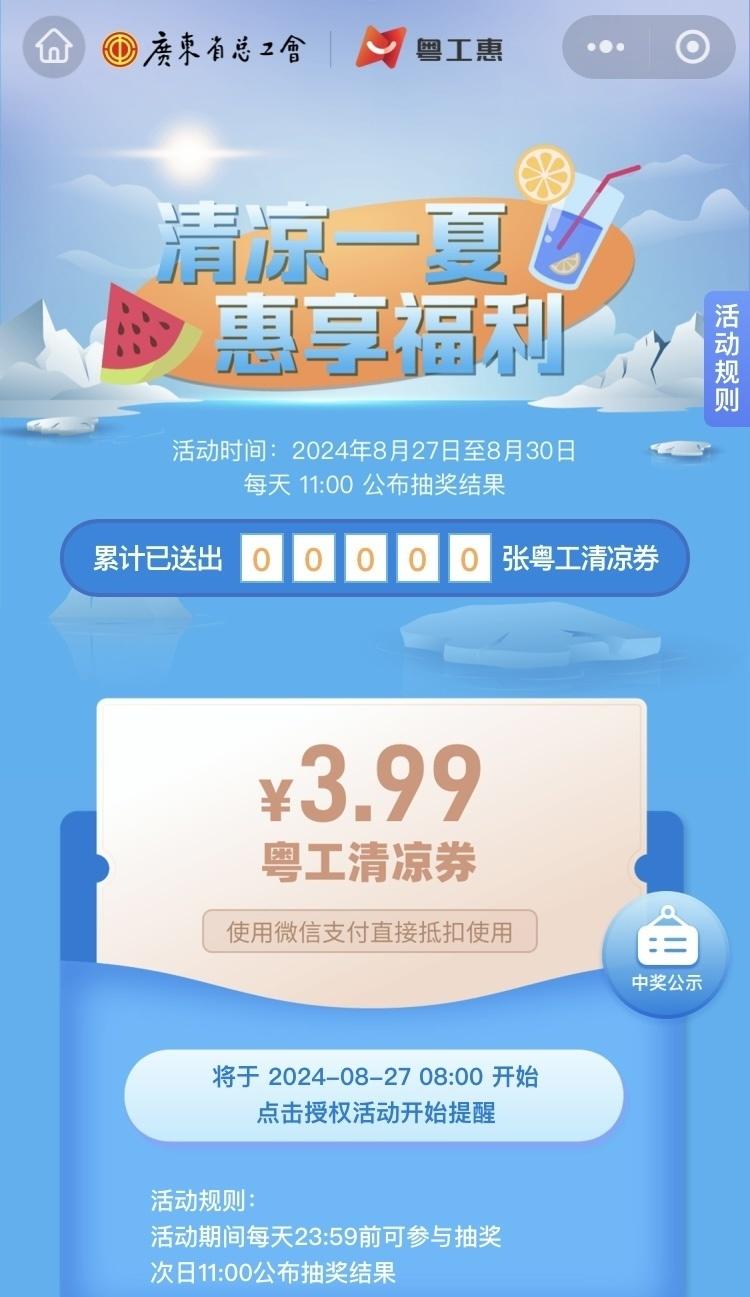 活动于8月27日8:00 至8月30日23:59开展。活动期间,每天发放“清凉券”6250张,全省粤工惠实名会员不限行业,每天23:59前均可参与抽奖。职工朋友可从“粤工惠”小程序、“粤工惠”App 进入活动页面。