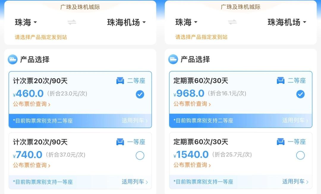 调整后,广珠及珠机城际铁路实施新型票制产品的车站为:广州南、北滘、顺德、顺德学院、容桂、南头、小榄、古镇、江海、江门东、礼乐、新会、中山北、中山、南朗、翠亨、珠海北、唐家湾、明珠、前山、珠海、湾仔北、十字门、横琴北、横琴、珠海长隆、井湾、三灶东、珠海机场。产品仅支持有运输能力的站间组合。