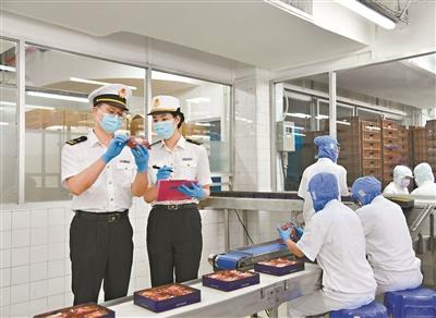 同乐海关查检一科科长姚冰表示:“针对月饼应节性强、保质期短的特点,我们安排专人‘一对一’对接企业,提前掌握企业排产计划,实施优先查验和检测,全面启用‘云签发’模式及时出具卫生证书,让企业实现出口签发足不出户‘零等待’,保障月饼顺畅通关。”